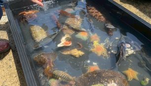 ・浅い水槽に入れた海の生き物を実際に触られるコーナーで、図鑑や水族館で見るだけでは分からないことが体感できます